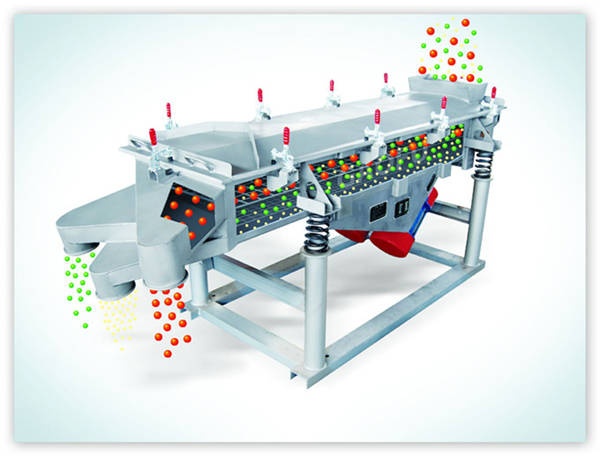 直線振動(dòng)篩(以下稱直線篩)利用振動(dòng)電機(jī)激振作為振動(dòng)源,使物料在篩網(wǎng)上被拋起,同時(shí)向前作直線運(yùn)動(dòng),物料從給料機(jī)均勻地進(jìn)入篩分機(jī)的進(jìn)料口,通過多層篩網(wǎng)產(chǎn)生數(shù)種規(guī)格的篩上物、篩下物、分別從各自的出口排出。具有耗能低、產(chǎn)量高、結(jié)構(gòu)簡(jiǎn)單、易維修、全封閉結(jié)構(gòu),無粉塵溢散,自動(dòng)排料,更適合于流水線作業(yè)。
